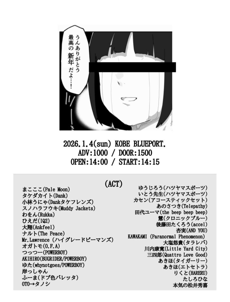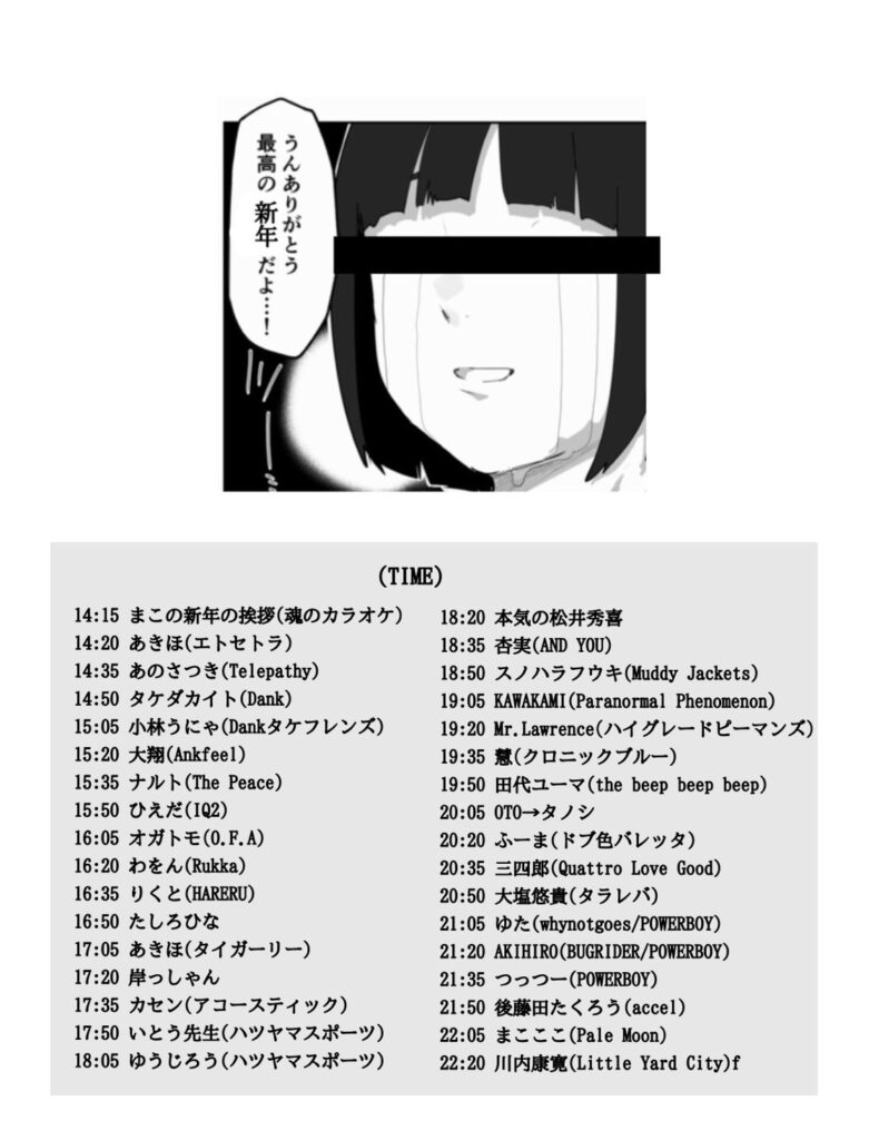 まこここ(Pale Moon) / AKIHIRO(BUGRIDER/POWERBOY) / ゆた(whynotgoes/POWERBOY) / ゆうじろう(ハツヤマスポーツ) / いとう先生(ハツヤマスポーツ) / スノハラフウキ(Muddy Jackets) / タケダカイト(Dank) / ナルト(ThePeace) / わをん(Rukka) / 杏実(AND YOU) / 岸っしゃん / 慧(クロニックブルー) / 後藤田たくろー(accel) / 三四郎(ex.ever youth) / ひえだ(IQ2) / 川内康寛(Litte Yard City / BLUEPORT.) / 大塩悠貴(タラレバ) / 大翔(Ankfeel) / 田代ユーマ(The beep beep beep) / 風馬(ドブ色バレッタ) / 小林うにゃ(タケフレンズ) / Mr.Lawrence(ハイグレードピーマンズ) / オガトモ(O.F.A) / つっつー(POWERBOY) / OTO→たのし / カセン / あのさつき(Telepathy) / KAWAKAMI(Paranormal Phenomenon) / あきほ(タイガーリー) / あきほ(エトセトラ) / りくと(HARERU) / たしろひな / 本気の松井秀喜