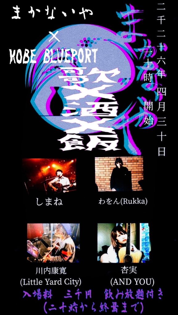 2026/04/30 まかないやx bLUEPORT presents”歌x酒x飯” OPEN:19:00 / START:20:00 - ADV:飲み放題3000yen / DOOR: 杏実(AND YOU) / しまね / わをん(Rukka) / 川内康寛(Little Yard City) *このイベントはまかないやにて行われます https://www.instagram.com/makanaiya.kobe SNSでシェア!! X で共有 (新しいウィンドウで開きます) X Facebook で共有 (新しいウィンドウで開きます) Facebook