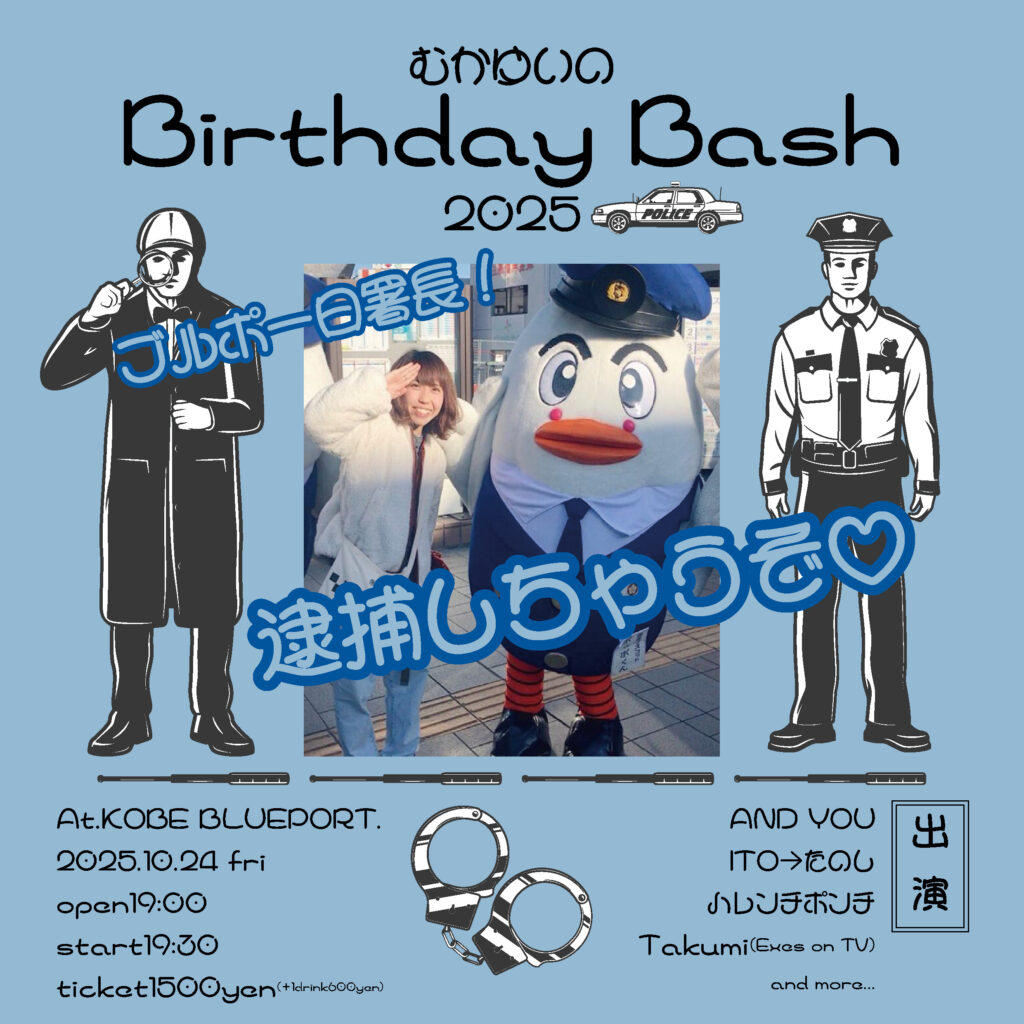 2025/10/24 むかゆいのBirthday Bash 2025!! OPEN:19:00 / START:19:30 - ADV:1500yen / DOOR:1500yen AND YOU / ITO→たのし / ハレンチポンチ / Takumi(Exes on TV) / and more… SNSでシェア!! クリックして X で共有 (新しいウィンドウで開きます) X Facebook で共有するにはクリックしてください (新しいウィンドウで開きます) Facebook