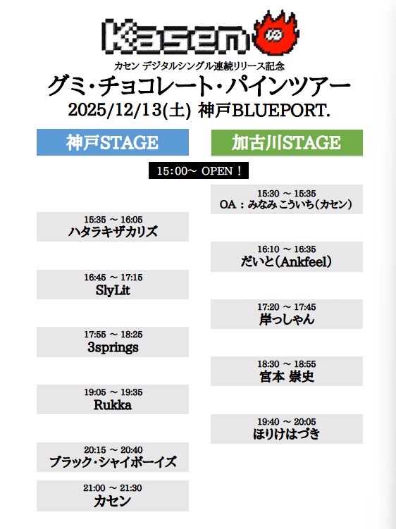 カセン / ハタラキザカリズ / ブラック・シャイボーイズ / Rukka / SlyLit / 3springs / 宮本崇史 / ほりけはづき / 岸っしゃん / だいと / OA.みなみこういち