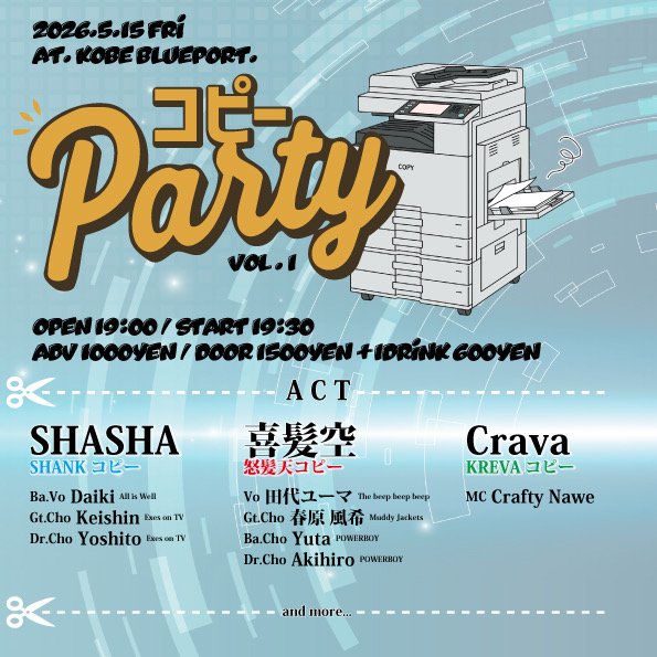 2026/05/15 コピーparty vol.1 OPEN:19:00 / START:19:30 - ADV:1000yen / DOOR:1500yen SHASHA / 喜髪空 / Crava / and more… SNSでシェア!! X で共有 (新しいウィンドウで開きます) X Facebook で共有 (新しいウィンドウで開きます) Facebook