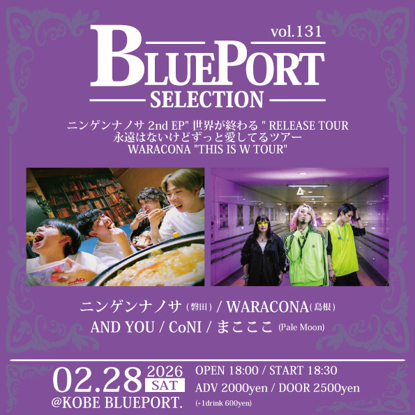 2026/02/28 BLUEPORT SELECTION vol.131-ニンゲンナノサ 2nd EP”世界が終わる” RELEASE TOUR 永遠はないけどずっと愛してるツアー & WARACONA “THIS IS W TOUR”- OPEN:18:00 / START:18:30 - ADV:2000yen / DOOR:2500yen ニンゲンナノサ(磐田) / WARACONA(島根) / AND YOU / CoNI / まこここ(Pale Moon) SNSでシェア!! X で共有 (新しいウィンドウで開きます) X Facebook で共有 (新しいウィンドウで開きます) Facebook