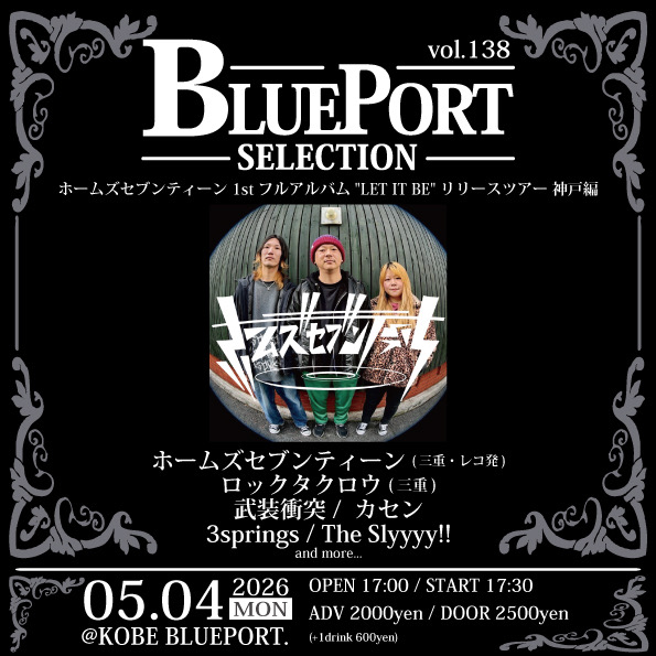 2026/05/04 BLUEPORT SELECTION vol.138-ホームズセブンティーン 1stフルアルバム”LET IT BE” リリースツアー 神戸編- OPEN:17:00 / START:17:30 - ADV:2000yen / DOOR:2500yen ホームズセブンティーン(三重・レコ発) / ロックタクロウ(三重) / 武装衝突 / カセン / 3springs / The Slyyyy!! / and more… SNSでシェア!! X で共有 (新しいウィンドウで開きます) X Facebook で共有 (新しいウィンドウで開きます) Facebook