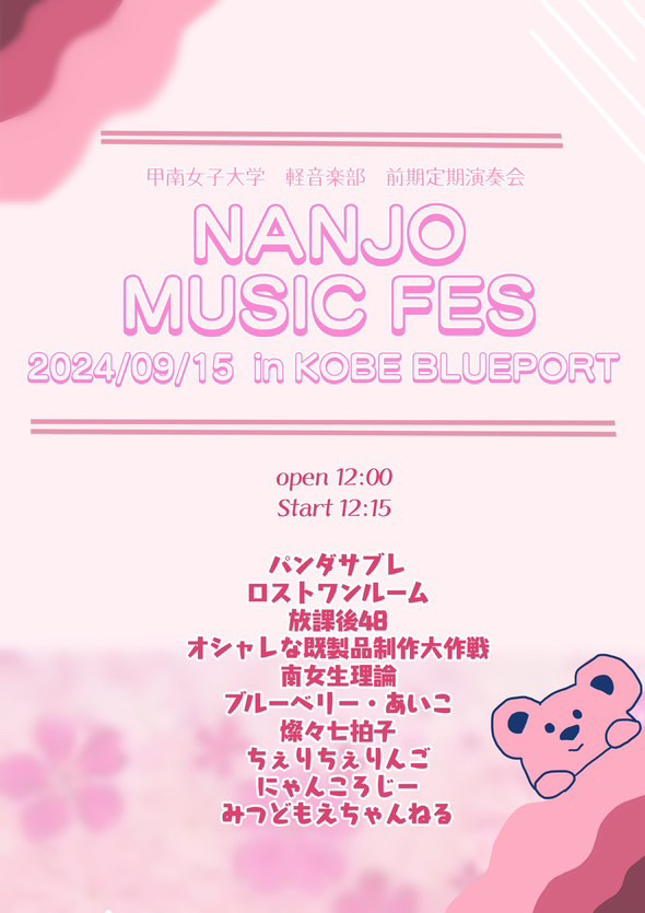 2024/09/15 甲南女子大学 軽音楽部 前期定期演奏会-NANJO MUSIC FES- OPEN:12:00 / START:12:15 - ADV: / DOOR: SNSでシェア!! クリックして X で共有 (新しいウィンドウで開きます) X Facebook で共有するにはクリックしてください (新しいウィンドウで開きます) Facebook