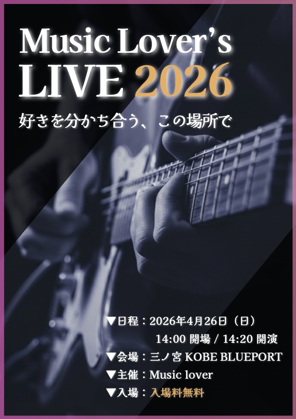 2026/04/26 Music Lovers’s LIVE 2026 OPEN:14:00 / START:14:20 - ADV:FREE / DOOR: SNSでシェア!! X で共有 (新しいウィンドウで開きます) X Facebook で共有 (新しいウィンドウで開きます) Facebook