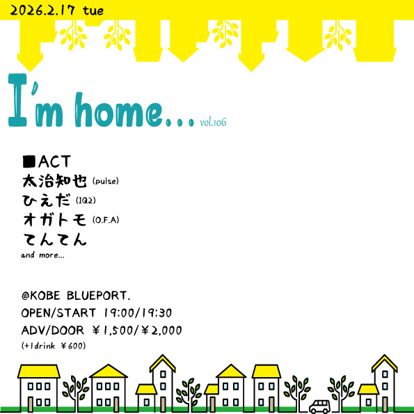 2026/02/17 I’m home…vol.106 OPEN:19:00 / START:19:30 - ADV:1500yen / DOOR:2000yen 太治知也(pulse) / ひえだ(IQ2) / オガトモ(O.F.A) / てんてん / and more… SNSでシェア!! クリックして X で共有 (新しいウィンドウで開きます) X Facebook で共有するにはクリックしてください (新しいウィンドウで開きます) Facebook