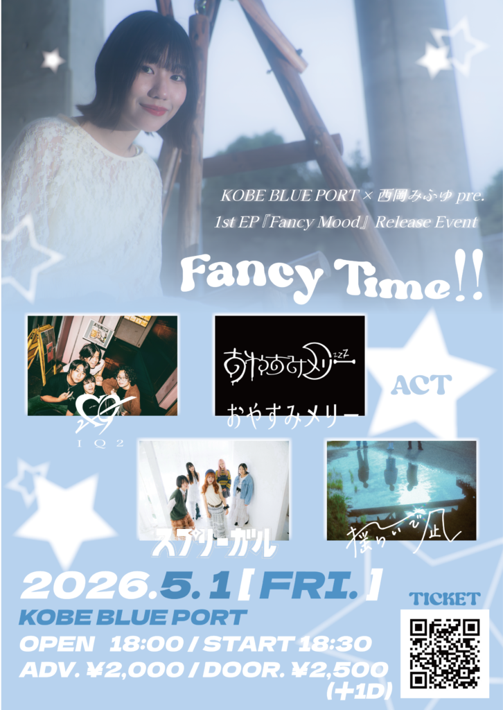 2026/05/01 KOBE BLUE PORT × 西岡みふゆ presents 1st EP 『Fancy Mood』Release Event “Fancy Time!!” OPEN:18:00 / START:18:30 - ADV:2000yen / DOOR:2500yen IQ2 / おやすみメリー / スプリーガル / 揺らいで凪 ticket :https://livepocket.jp/e/rs2n8 SNSでシェア!! X で共有 (新しいウィンドウで開きます) X Facebook で共有 (新しいウィンドウで開きます) Facebook