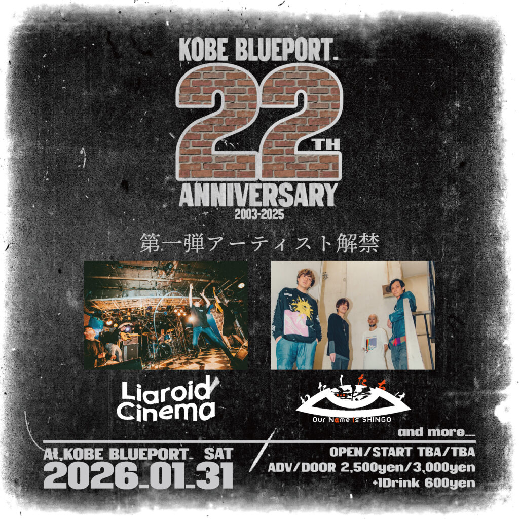 2026/01/31 KOBE BLUEPORT.22th ANNIVERSARY!!! OPEN:TBA / START:TBA - ADV:2500yen / DOOR:3000yen わたしたちは真悟 / Liaroid Cindma / and more… SNSでシェア!! クリックして X で共有 (新しいウィンドウで開きます) X Facebook で共有するにはクリックしてください (新しいウィンドウで開きます) Facebook