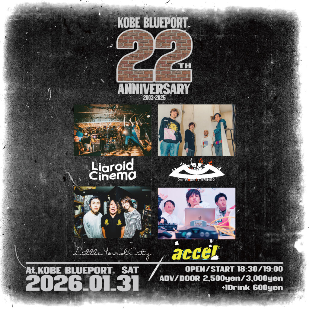 2026/01/31 KOBE BLUEPORT.22th ANNIVERSARY!!! OPEN:18:30 / START:19:00 - ADV:2500yen / DOOR:3000yen わたしたちは真悟 / Liaroid Cindma / accel / Little Yard City SNSでシェア!! クリックして X で共有 (新しいウィンドウで開きます) X Facebook で共有するにはクリックしてください (新しいウィンドウで開きます) Facebook