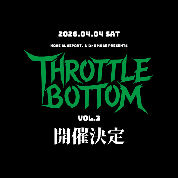 2026/04/04 KOBE BLUEPORT. x DxQ KOBE presents “THROTTLE BOTTOM vol.3″開催決定!! OPEN:TBA / START:TBA - ADV:2500yen(大学生以下200yen / 高校生以下1000yen) / DOOR:3000yen SNSでシェア!! X で共有 (新しいウィンドウで開きます) X Facebook で共有 (新しいウィンドウで開きます) Facebook