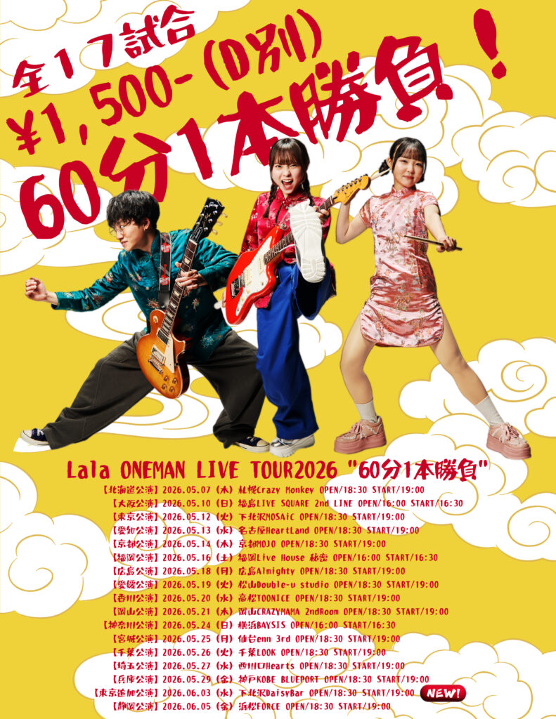 2026/05/29 Lala ONEMAN LIVE TOUR2026 “60分1本勝負” OPEN:18:30 / START:19:00 - ADV:1500yen / DOOR: Lala SNSでシェア!! X で共有 (新しいウィンドウで開きます) X Facebook で共有 (新しいウィンドウで開きます) Facebook