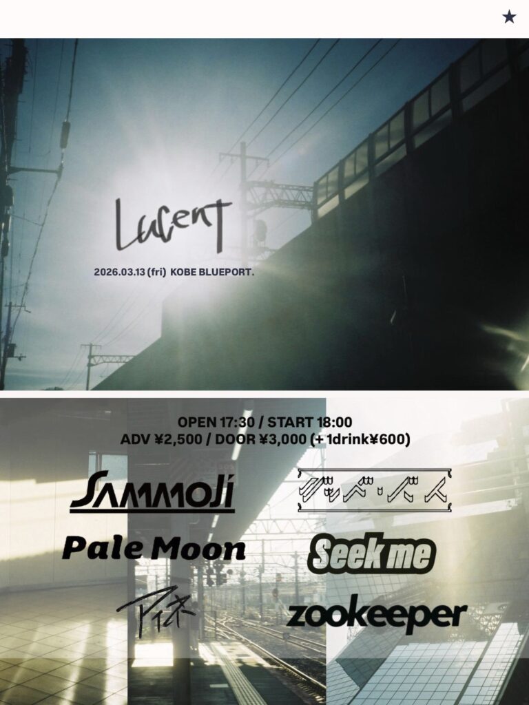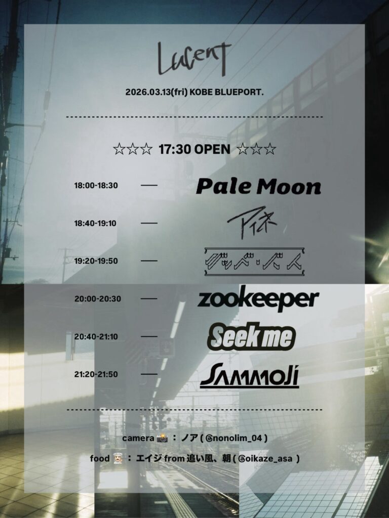2026/03/13 LUCENT OPEN:17:30 / START:18:00 - ADV:2500yen / DOOR:3000yen SAMMOJI / グッド・バイ / Pale Moon / seek me / アイネ / zookeeper camera : ノア food : エイジ from 追い風、朝 SNSでシェア!! X で共有 (新しいウィンドウで開きます) X Facebook で共有 (新しいウィンドウで開きます) Facebook