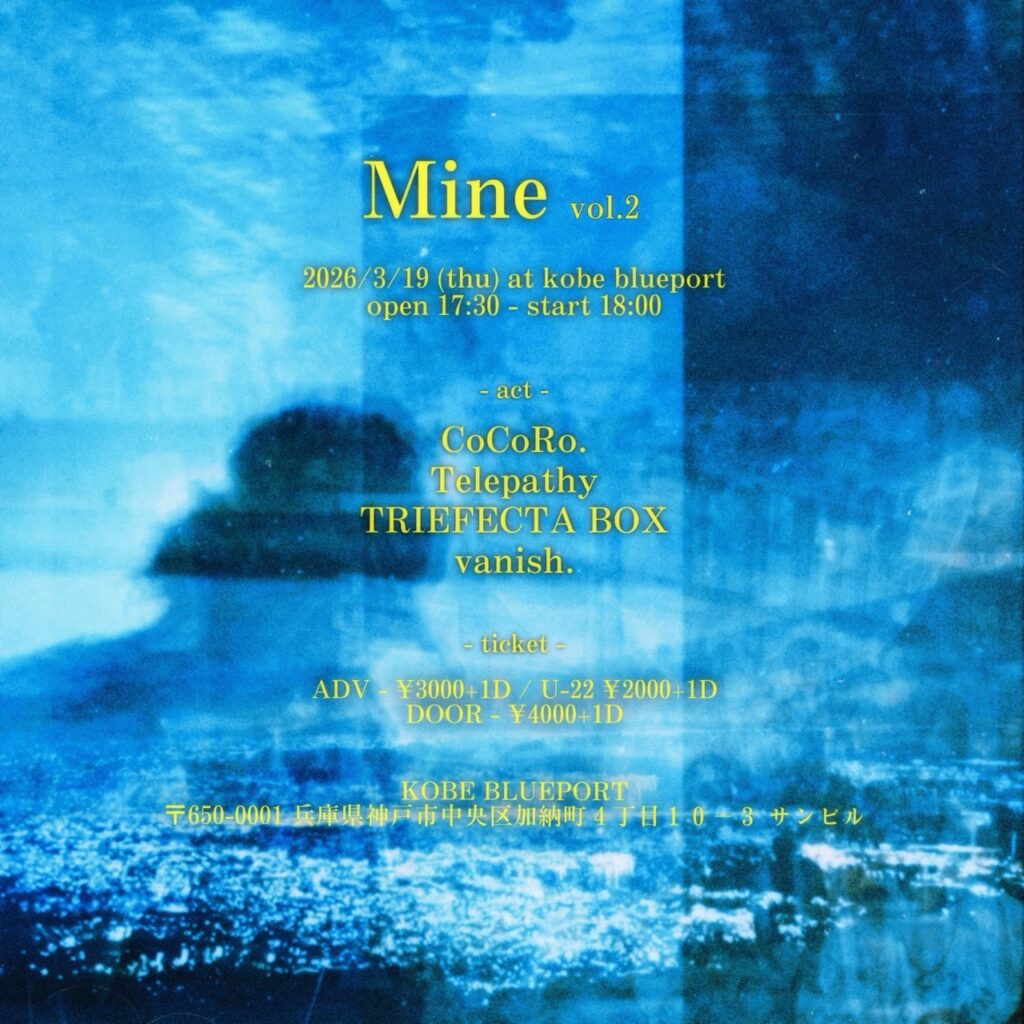 2026/03/19 Mine vol.2 OPEN:17:30 / START:18:00 - ADV:3000yen / U22 2000yen / DOOR:4000yen CoCoRe. / Telepathy / TRIEFECTA BOX / vanish. SNSでシェア!! クリックして X で共有 (新しいウィンドウで開きます) X Facebook で共有するにはクリックしてください (新しいウィンドウで開きます) Facebook