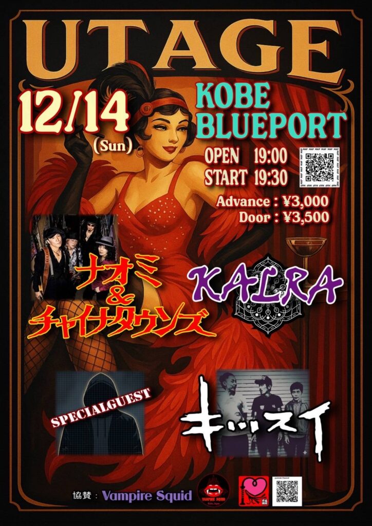2025/12/14 UTAGE OPEN:19:00 / START:19:30 - ADV:3000yen / DOOR:3500yen KALRA / ナオミ&チャイナタウンズ / キッスイ / ➕Special guest SNSでシェア!! クリックして X で共有 (新しいウィンドウで開きます) X Facebook で共有するにはクリックしてください (新しいウィンドウで開きます) Facebook
